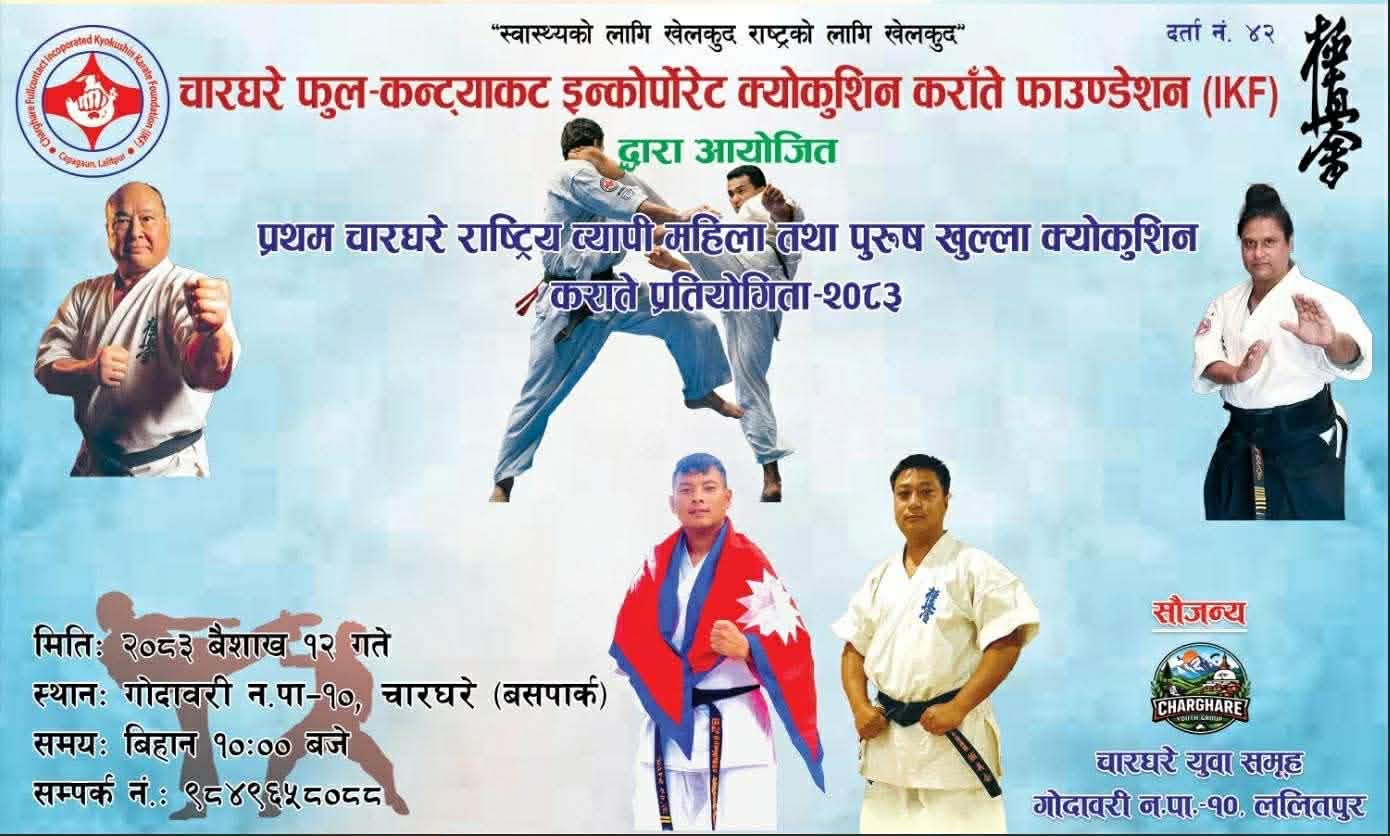 "स्वास्थ्यको लागि खेलकुद, राष्ट्रको लागि खेलकुद" भन्ने मूल नाराका साथ ललितपुरको गोदावरीमा 'प्रथम चारघरे राष्ट्रिय व्यापी महिला तथा पुरुष खुल्ला क्युकोशिन कराते प्रतियोगिता-२०८३' भव्यताका साथ सम्पन्न भएको छ। चारघरे फुल-कन्ट्याक्ट इन्कोपोरेट क्युकोशिन कराते फाउन्डेसन (IKF) द्वारा आयोजित यस प्रतियोगिताको मुख्य प्रायोजन चारघरे युवा समूहले गरेको थियो। फाउन्डेसनका अध्यक्ष हेम राज तामाङको अध्यक्षतामा आयोजित उक्त कार्यक्रममा स्थानीय जनप्रतिनिधि र सुरक्षा निकायका प्रमुखहरूको उल्लेखनीय उपस्थिति रहेको थियो।कार्यक्रममा प्रमुख अतिथिको रूपमा गोदावरी नगरपालिकाका प्रमुख गजेन्द्र महर्जन सहभागी हुनुहुन्थ्यो। त्यसैगरी, विशेष अतिथिका रूपमा गोदावरी वडा नं. १० का वडा अध्यक्ष शेखर न्यौपाने र चापागाउँ महानगरीय प्रहरी वृत्तका प्रमुख शिला थापा उपस्थित हुनुहुन्थ्यो।